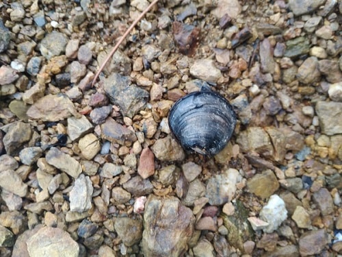 水際の水のないところを見ると二枚貝の死骸が多数あることがわかりました。