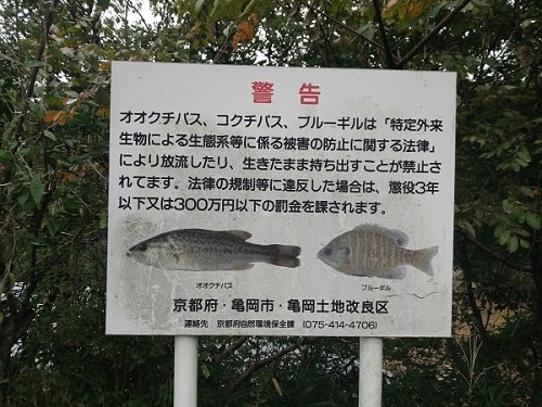 外来魚のブラックバスとブルーギルに関して看板があります。