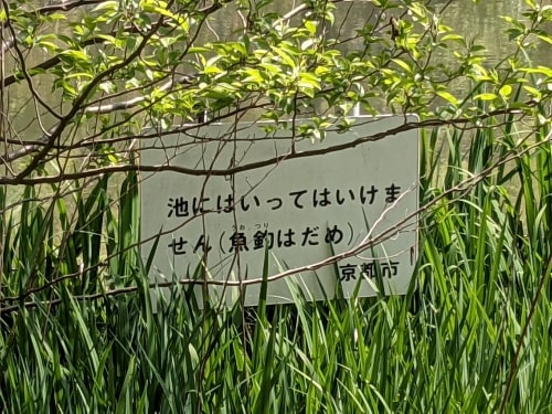 池を見渡すとやはり「釣り禁止」の看板が見えます。