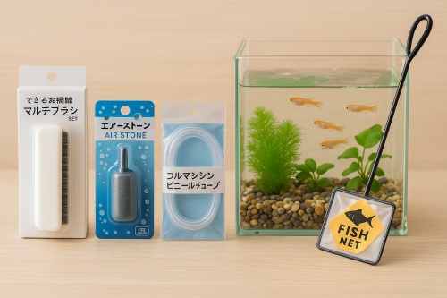 掃除道具としては「小型クリーナーポンプ」や「メラミンスポンジ」が便利です。これらも100円で揃うので、最初に一緒に購入しておくと管理が楽になります。